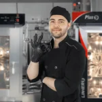 Chef cocinando en una cocina industrial con hornos de convección LINHER al fondo